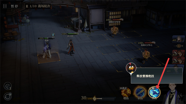 4、消耗戰魂釋放絕技,如曹操的絕技,釋放后對敵人造成高額傷害,提升戰斗效果,助力擊敗敵人。