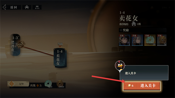 3、在關卡選擇界面,可選擇如賣花女等關卡,點擊進入關卡按鈕,消耗相應資源開啟新的戰斗挑戰,獲取關卡獎勵。
