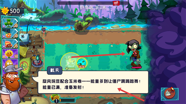 3、戰斗時會有提示,比如旋風豌豆配合玉米卷的效果,了解這些提示,能更好地運用植物組合,攻擊僵尸。