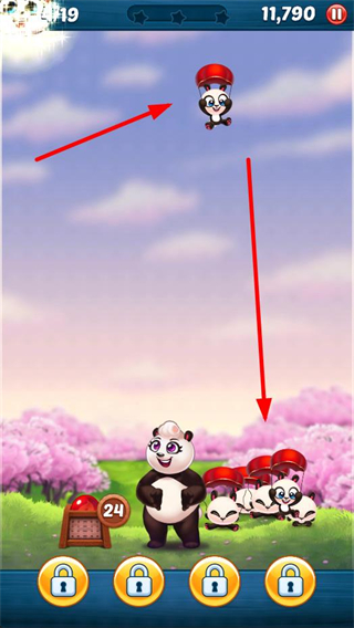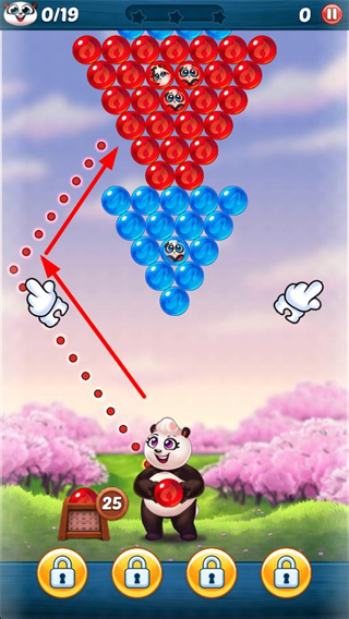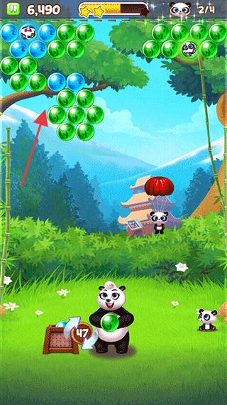 2、瞄準對應顏色的泡泡區域發射,消除泡泡來解救被困的熊貓寶寶,積累解救數量并獲取積分。