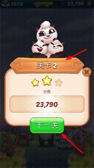 4、查看關卡的得分與星級評價,點擊下一關按鈕,開啟新一輪的泡泡消除與熊貓救援挑戰。