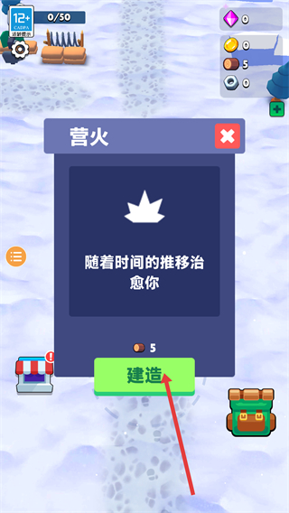 4、遇到營火建造提示時,花費材料,點擊建造,營火能隨著時間推移治愈角色,助力在雪地中的探索與建造。
