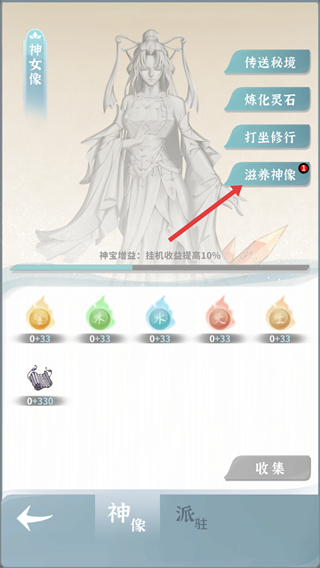 2、可在神女神像處選擇滋養神像等操作,提升掛機收益,助力修仙成長,豐富游戲玩法。