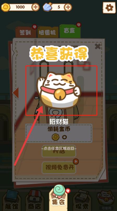 1、游戲界面彈出恭喜獲得提示窗口,展示獲取的招財貓,點擊窗口任意空白區域,關閉該提示,回到主場景。