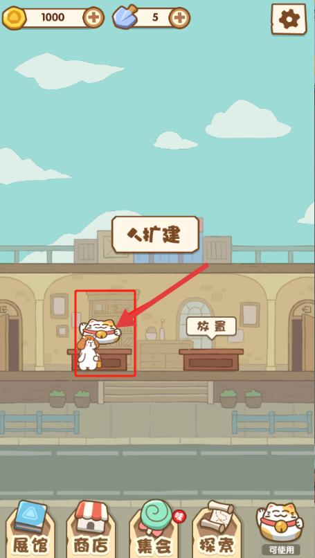 2、返回主場景后在帶有建筑的區域內,找到標注可放置的對應位置,點擊該位置,將招財貓放置到指定建筑區域,完成布置操作。