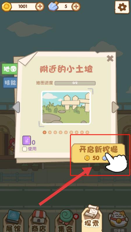3、點擊底部功能欄中的探索按鈕,進入探索功能界面,找到附近的小土坡地圖板塊,開啟新挖掘,嚴格依照游戲系統給出的指引,逐步推進挖掘探索相關操作。