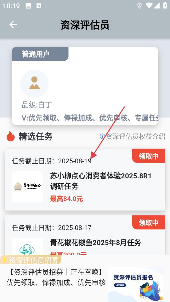 2、資深評估員頁面,普通用戶品級白丁,有蘇小柳點心調研任務,最高獎勵84元,任務領取中。