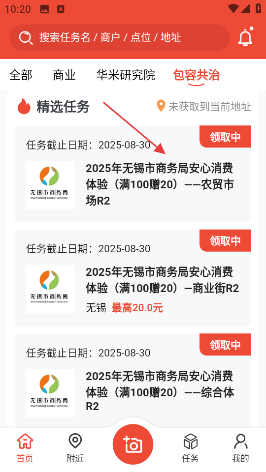 3、包容共治標簽下,展示無錫市商務局安心消費體驗任務,任務截止日期,處于領取中狀態。