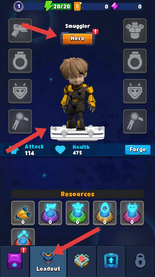 3、在裝備界面,可查看英雄Smuggler的攻擊,生命值等屬性,從Loadout欄選擇武器,裝備等,為戰斗做準備。