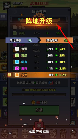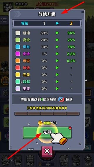 2、進行陣地升級,消耗金幣充能提升陣地等級,提高獲得高級裝備的概率,助力裝備獲取。