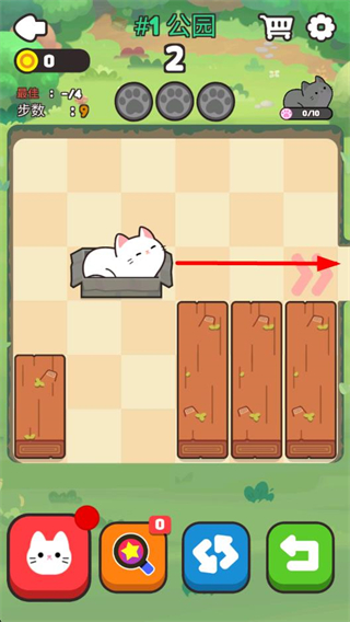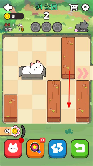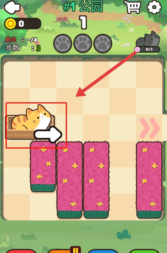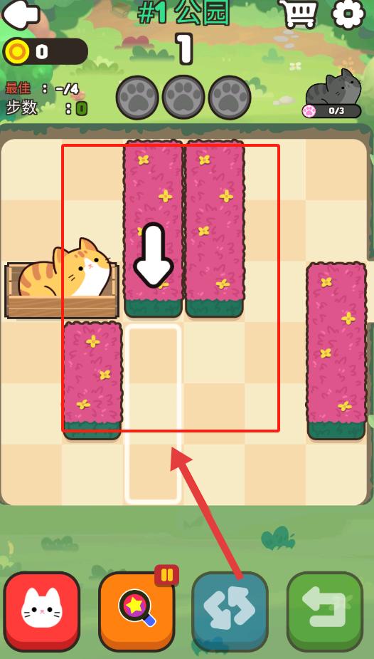 2、進入1公園關卡,觀察場景內貓咪位置及粉色帶花障礙物布局,根據界面箭頭指引,通過滑動、點擊操作,推動粉色障礙物,為貓咪移動騰出路徑。