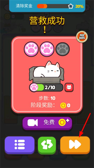 4、完成營救后會顯示營救成功界面,查看步數和階段獎勵,點擊前進按鈕,進入下一個關卡繼續挑戰。