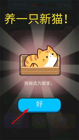 1、看到養一只新貓的提示,點擊好按鈕,確認成為貓咪管家,開啟后續的貓咪營救玩法。