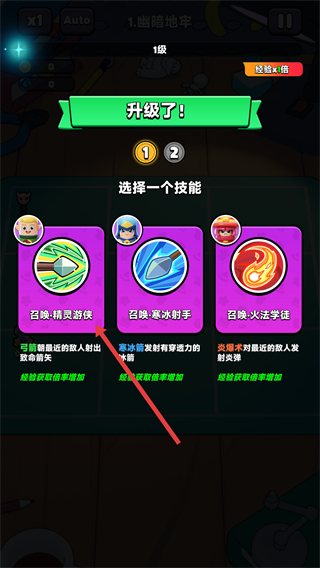 2、升級后可選擇技能,如召喚精靈游俠,獲得新的戰斗單位,增強防御陣容,提升打怪效率。