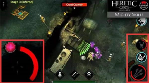 1、玩家在戰斗時,左側輪盤控制移動,右側技能圖標按需釋放,應對Crypt Crawler等敵人,利用技能清怪推進關卡。