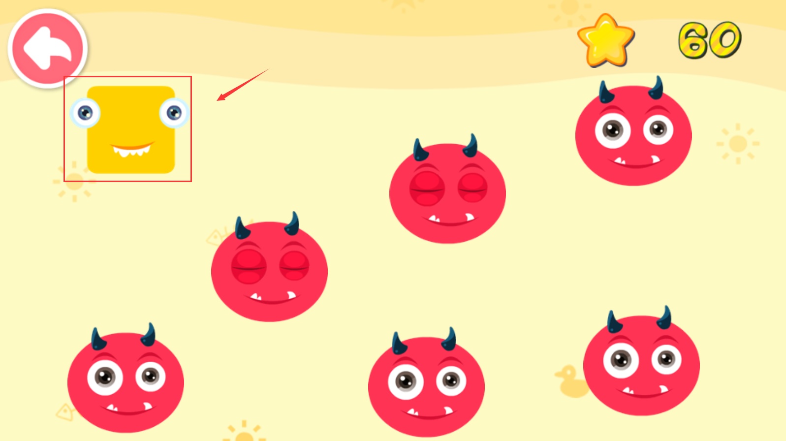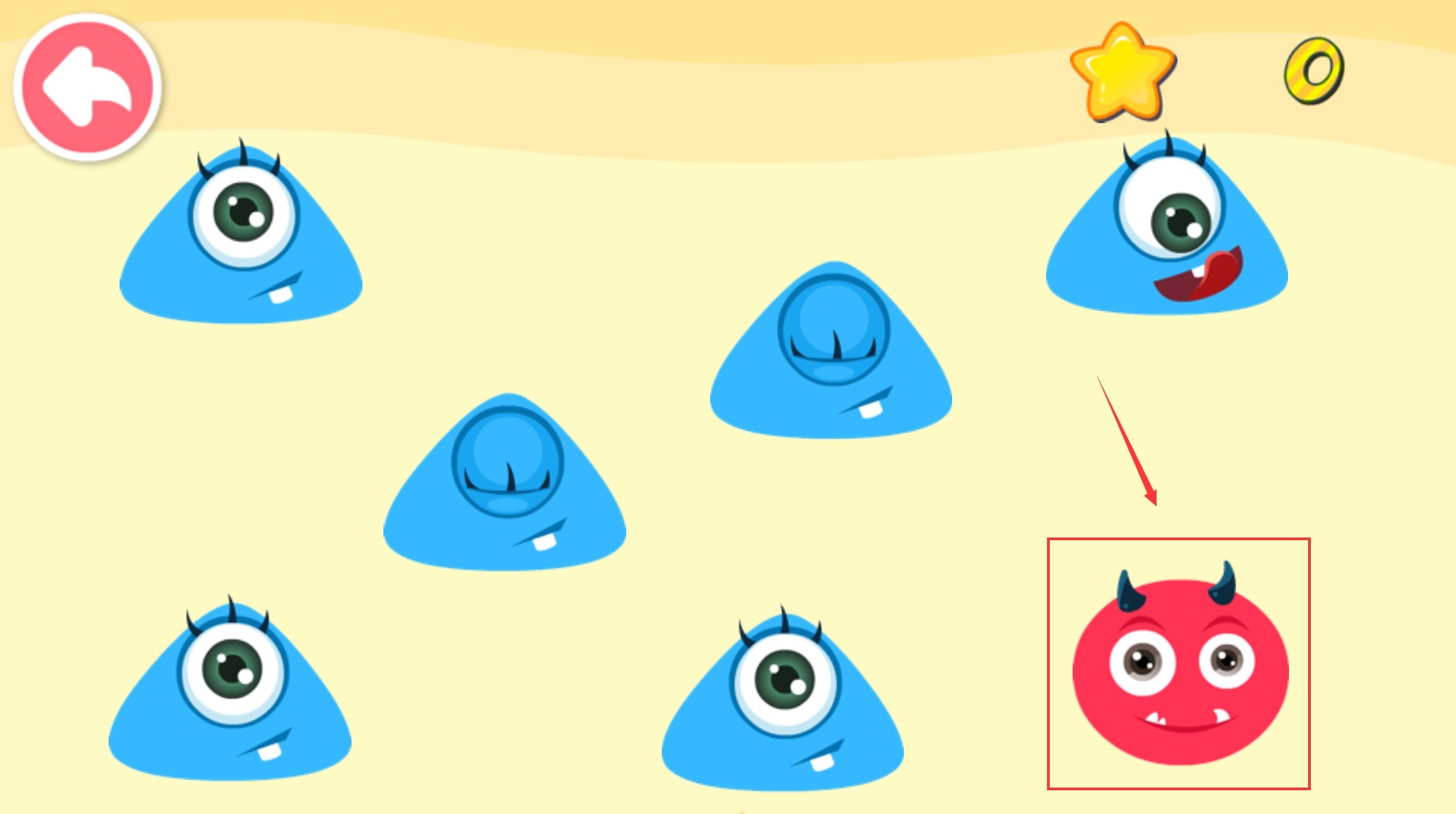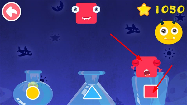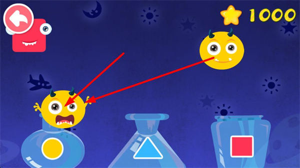 2、把紅色萌怪移動到帶有紅色圖案的容器上方,讓萌怪對應到匹配圖案的容器處,完成配對的同時提升星星分數。