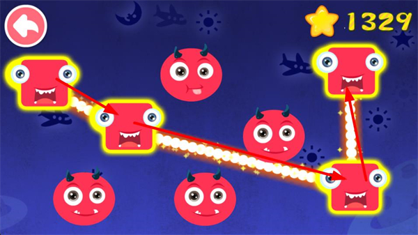 4、連接相同樣式的紅色萌怪,讓它們之間形成連線,觸發互動效果,同時星星分數進一步提升。