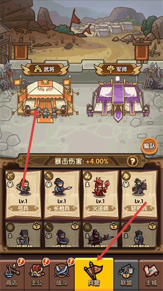 3、在兵營界面可查看武將、軍師及弓兵、長槍兵等兵種,點擊武將帳篷可進行武將相關操作,組建軍隊。
