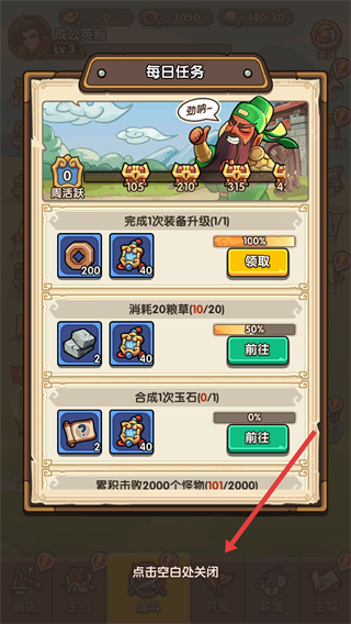 1、在每日任務界面可查看完成裝備升級、消耗糧草等任務,完成后領取獎勵,點擊空白處關閉界面。