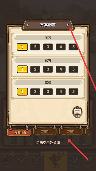 4、在方案配置界面可設置玉石、武將、軍師的方案,選擇不同方案,點擊空白處關閉界面,管理策略配置。