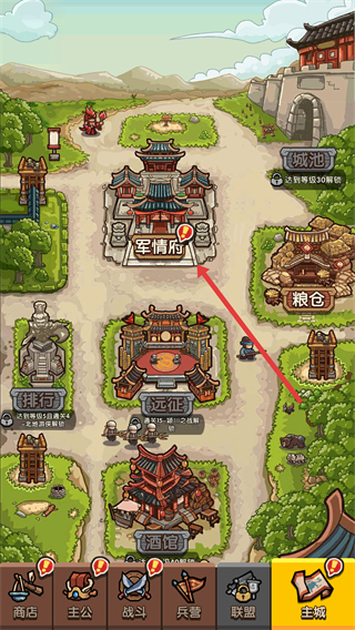 2、在主城界面可查看軍情府、糧倉、錢莊等建筑,點擊建筑可進行相關操作,管理城池建設。