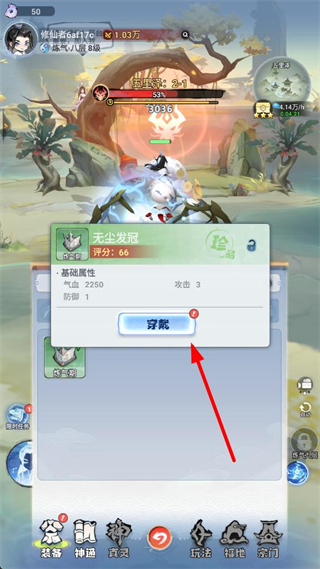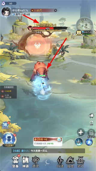 2、挑戰新的修仙怪物,使用技能造成傷害,推進關卡進度,獲取戰斗經驗和獎勵,提升角色的修仙等級和戰力。