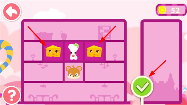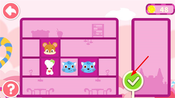 4、繼續按照萌物的居住偏好,調整架子上的萌物位置,讓適配的萌物相鄰,完成布局后點擊對勾,持續推進房間分配的關卡。