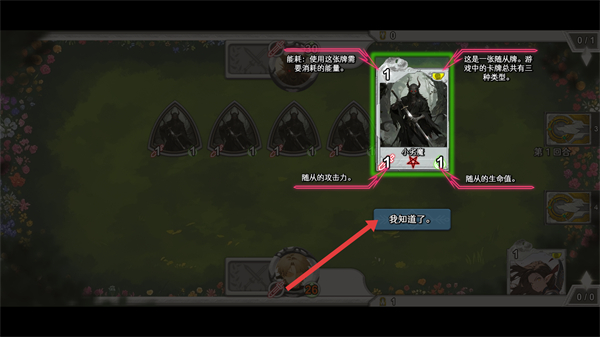 4、可查看隨從卡牌的屬性,如攻擊力、生命值等,了解卡牌效果,點擊我知道了繼續游戲,提升對戰策略。