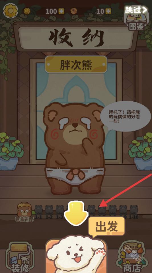 2、進入游戲場景后,于界面呈現的收納胖次熊交互區域,找到并點擊比熊角色觸發工坊歡迎流程。