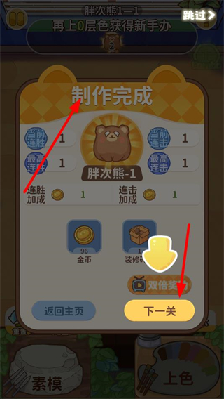 3、手辦制作完成后,可獲得金幣、裝修錘等獎勵,點擊下一關繼續制作更多手辦。