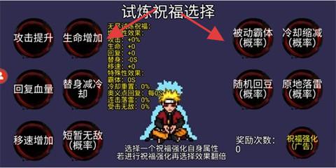 4、無盡模式挑戰:選擇無盡試煉模式,挑選祝福,搭配忍者技能、通靈獸和秘卷,點擊開戰,從第一層開始向上挑戰,不斷突破自我。
