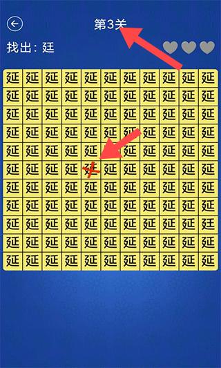 1、聚焦漢字找茬,滿屏延字間藏著廷字,關卡標注第3關,上方顯示愛心生命值,紅色標記突出目標,挑戰漢字細節觀察能力。