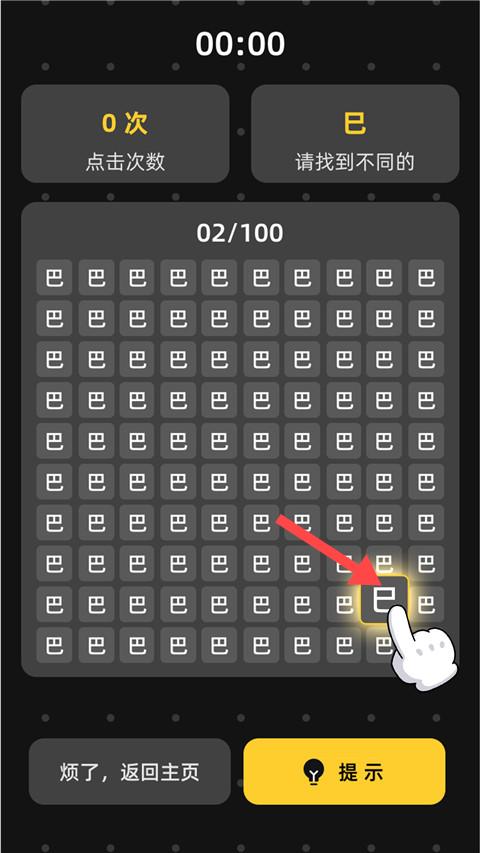 3、不同文字關卡滿屏巴字間藏著巳字,計時啟動后需快速識別點擊,上方統計點擊次數與目標,考驗眼力和反應速度。