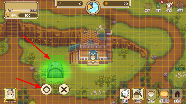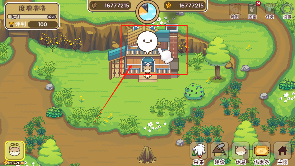 1、點擊開始按鈕,進入游戲營地界面,查看房屋、資源分布,熟悉地圖、圖鑒等功能入口,準備經營。