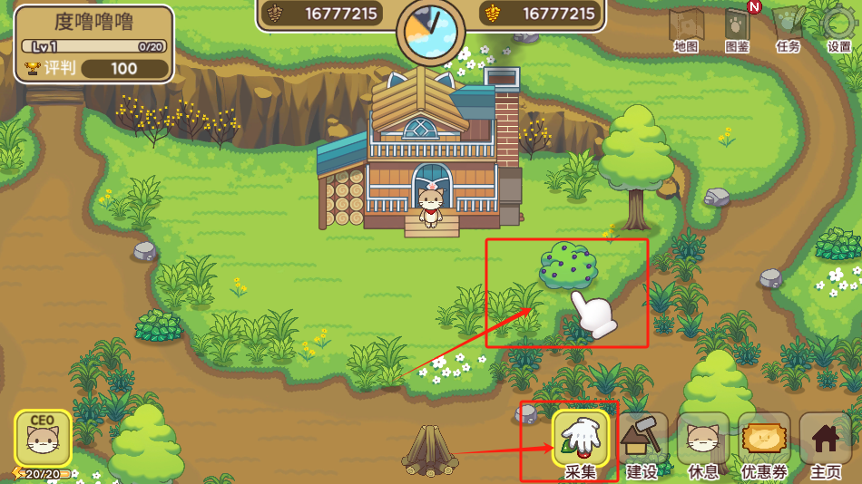 3、點擊采集按鈕,選擇營地內資源點,如藍莓樹,進行采集,獲取資源后,用于營地升級、貓咪養成,持續經營。