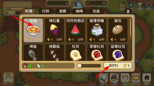 4、在料理界面,選擇要制作的食物如拉面,消耗對應材料后點擊制作按鈕,等待制作完成,獲得食物用于恢復角色狀態。