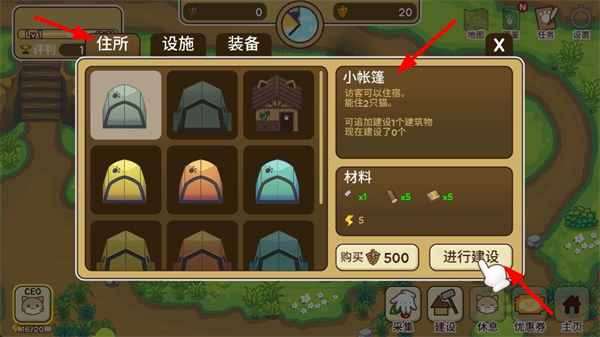 2、進入建設界面的住所分類,選擇小帳篷,消耗對應材料后點擊進行建設按鈕,即可在場景里搭建該設施,拓展家園功能。