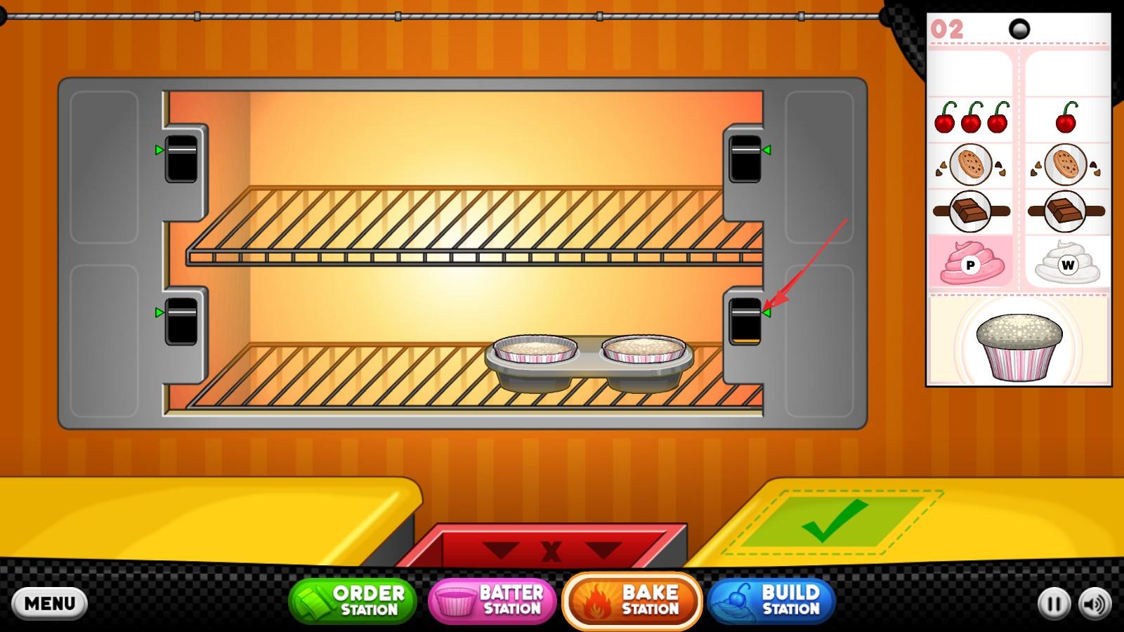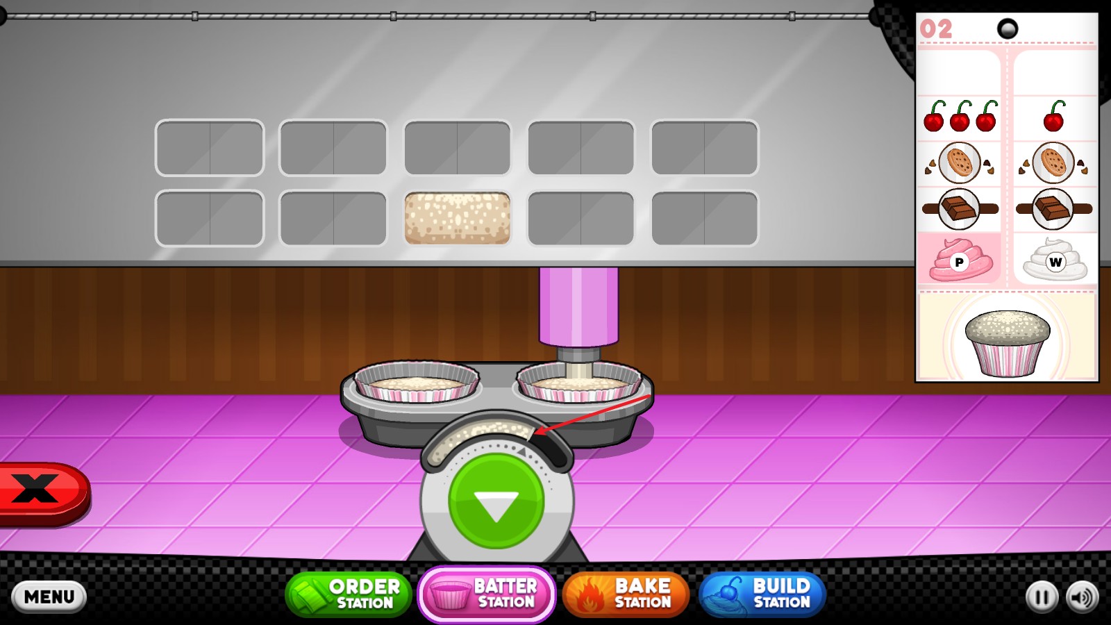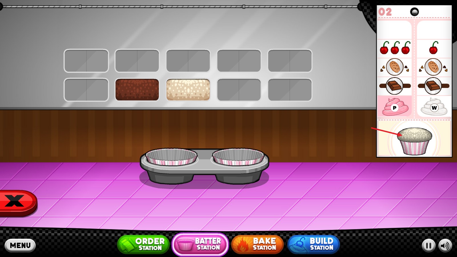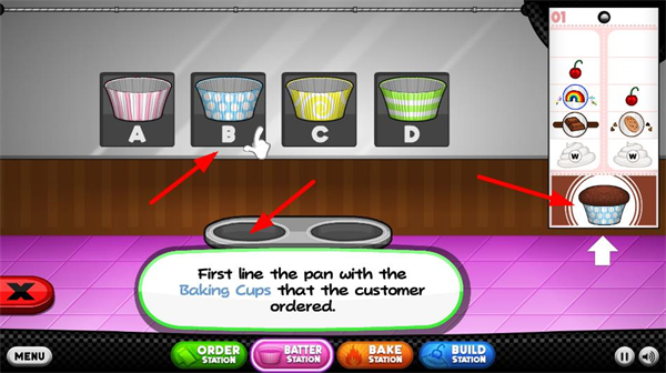 4、進入面糊站界面,根據顧客訂單選擇對應的烘焙杯,將其放入烤盤內,完成制作紙杯蛋糕的前期備料步驟。