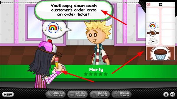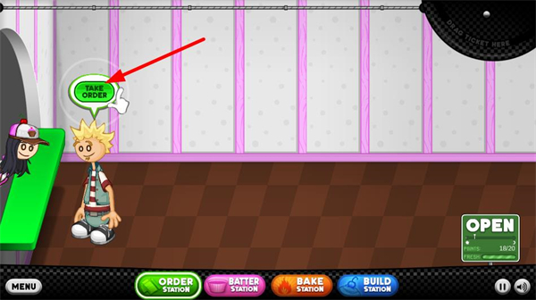 2、進入場景后看到顧客出現,界面顯示TAKE ORDER提示,點擊對應區域接收顧客訂單,開啟紙杯蛋糕的制作流程。