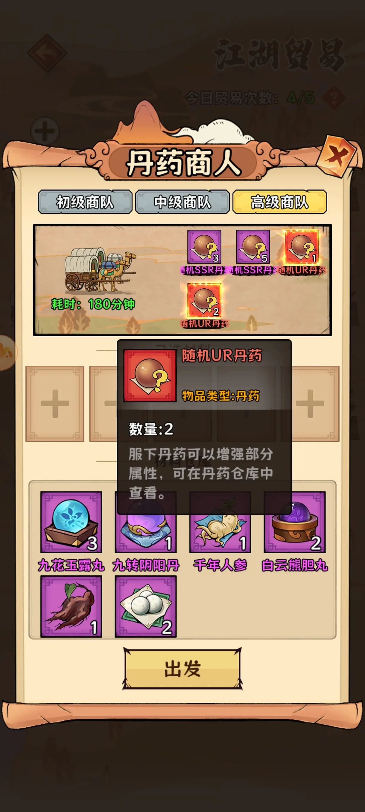 2、江湖貿易可通過以丹換丹或材料兌換獲取資源,建議每日用溢出低階丹藥兌換高級丹藥,用重復材料按5:1比例兌換稀缺材料。