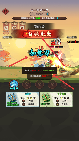 1、會遇到首領關卡,使用如如意刀等武功攻擊首領,造成傷害,擊敗首領可推進關卡進度。