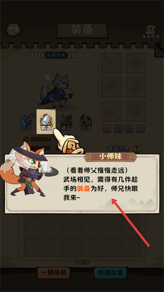 4、在裝備界面,可獲取轎冠等裝備,裝備合適的裝備能提升戰力,小師妹會引導你獲取趁手裝備。