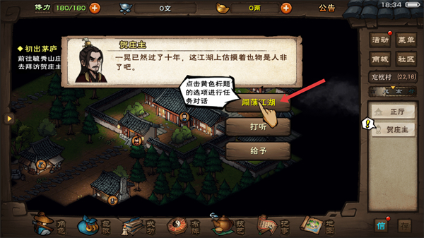 2、與NPC對話時可選擇詢問江湖等選項,進行任務對話,獲取任務信息和獎勵,提升角色實力。