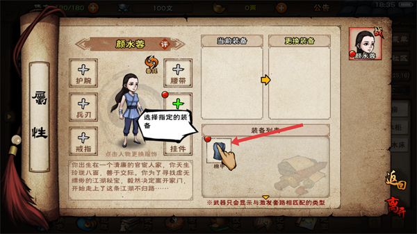 4、可在屬性界面裝備指定裝備,如掛件,裝備后提升角色屬性,助力在江湖戰斗和探索。