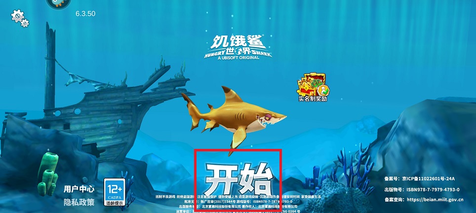 1、打開佳作后點擊開始游戲,進入充滿多樣海洋生物的佳作場景,準備開始鯊魚的獵殺與升級之旅。