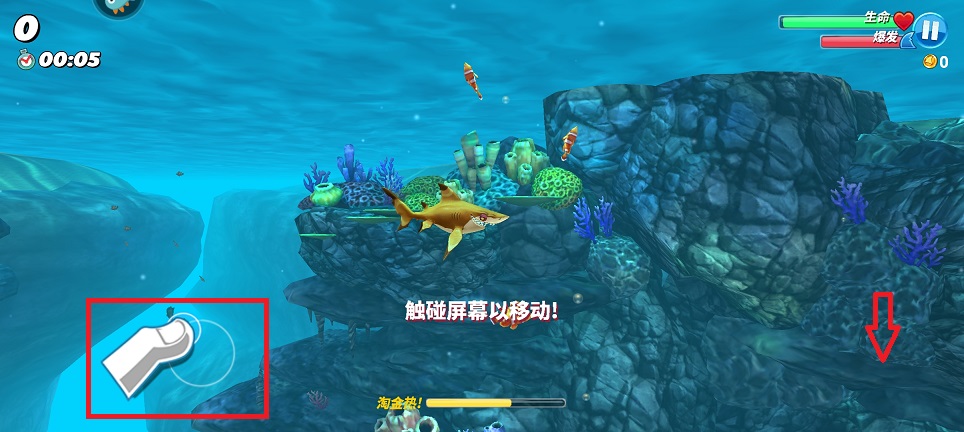 1、進入海洋場景,界面提示觸碰屏幕以移動,通過觸摸屏幕不同區域,控制鯊魚方向,在水下環境中穿梭,躲避障礙、尋找食物。