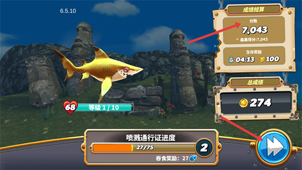 1、在海洋冒險中鯊魚進食小魚等食物,積累能量,界面出現升級提示,獲取金幣、沖刺等增益,提升鯊魚能力,推進成長進程。