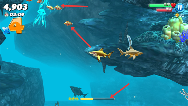 1、鯊魚可捕食多種魚類,積累分數和黃金熱進度,黃金熱觸發后捕食得分效率提升,推進游戲進程。
