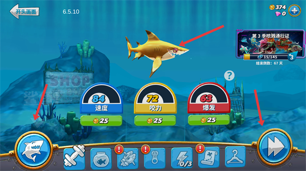4、可使用金幣提升鯊魚速度、咬力等屬性,還可查看通行證等內容,不斷強化鯊魚,探索更廣闊的海域。