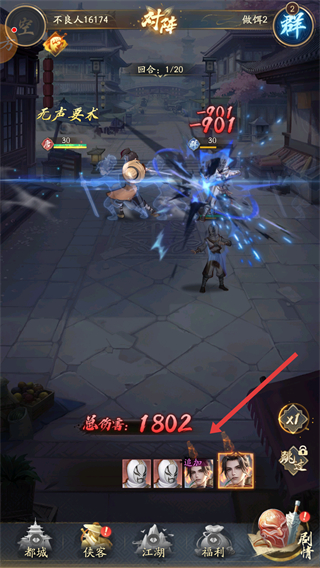 2、角色釋放技能如無聲要術,對敵人造成傷害,界面顯示傷害數值和總傷害,可切換俠客調整戰斗策略。